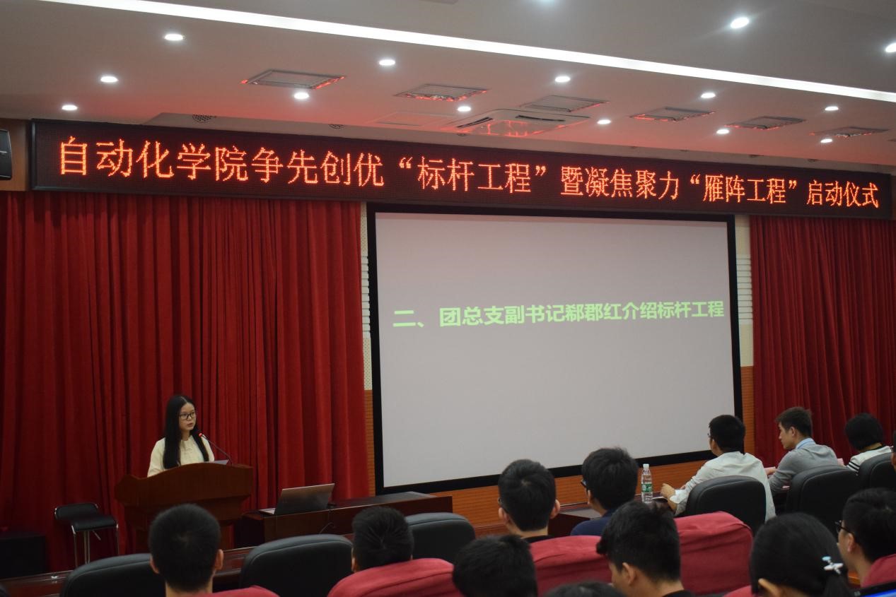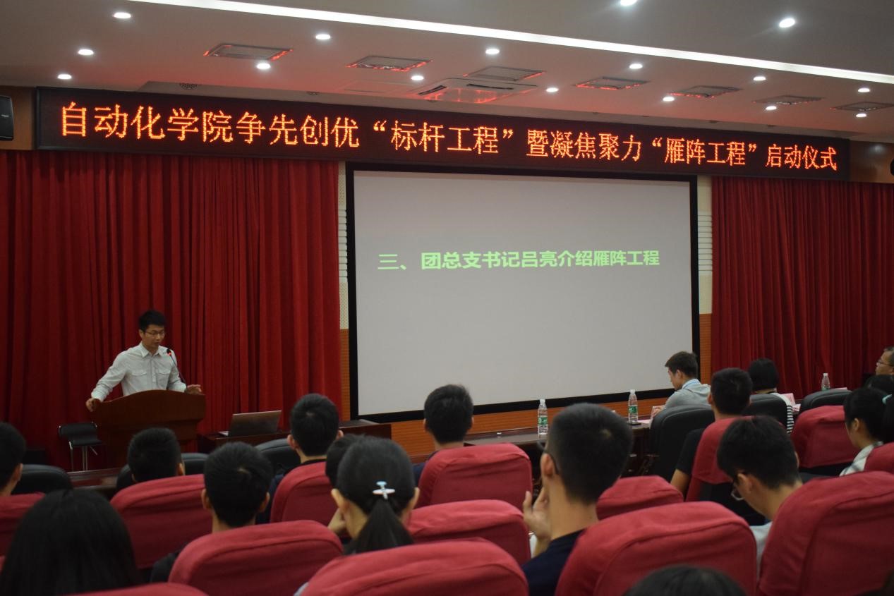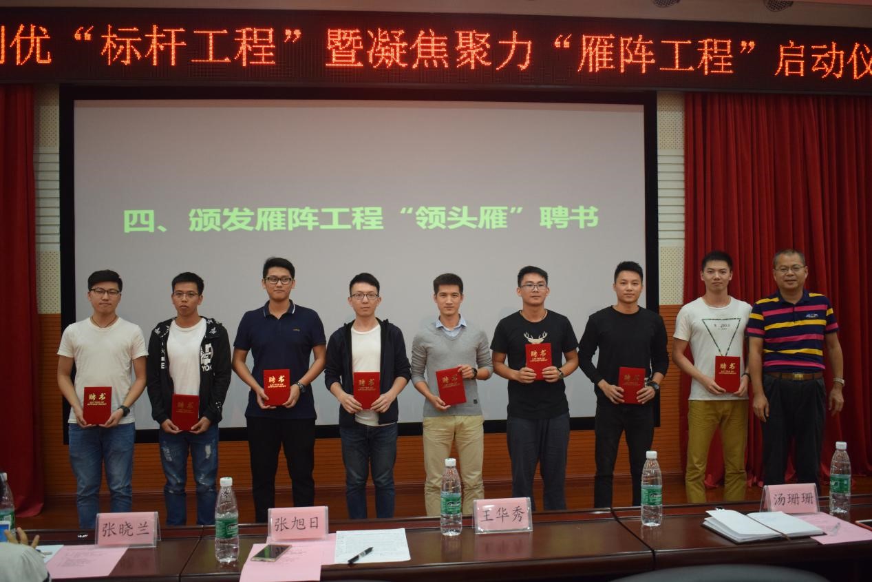为树立立德树人的教育根本任务,围绕公司人才培养目标,充分发挥教工党员、员工党员、科创标兵和员工干部的模范带头作用,实现“1+1>2”的雁阵效应,公司推出了标杆工程以及雁阵工程项目,并且于2017年10月19日星期四下午2点在白云校区报告厅举办了启动仪式。出席本次会议的有公司党委书记张旭日、党委副书记王华秀、实验室指导老师、辅导员老师们以及公司员工干部、各班员工代表。