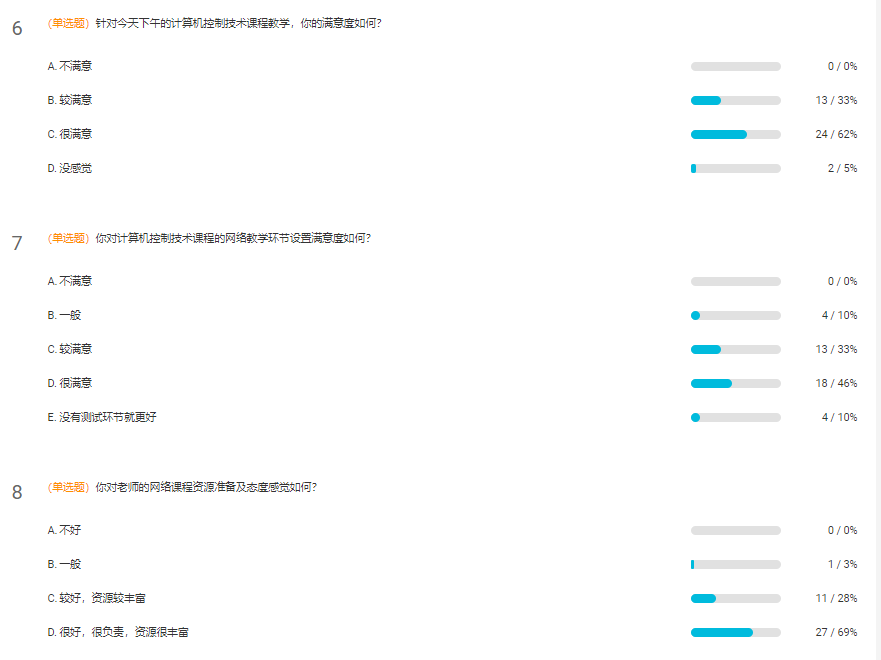 通过前期的精心准备和设计,实际的直播效果喜出望外,令人欣慰。直播课堂中同学们问答问题非常积极,部分同学提出的问题新颖有难度,且将其它课程所学与本课程知识对比思考,足以说明员工在直播教学课堂中能紧跟老师节奏,时刻带着问题听课,注意力集中,相比面授课堂更放得开,思考更专注。更难能可贵的是,通过直播回答环节,同学们真正做到了提前观看平台中的微视频资源,而不只是为了获得进度加分而快进。图4的反馈结果也说明员工对老师设计的云教学模式是很相当满意和认可的。
