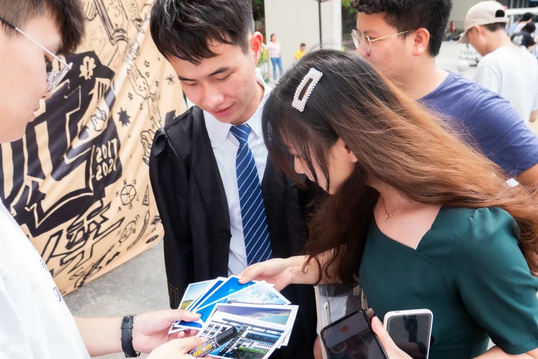 上午8点30分,毕业季活动正式开始。毕业生们身着学士服,头戴学士帽,神采飞扬。他们来到活动地点并踊跃地参与其中,相信能为4年老员工活留下最后最美好的回忆。为此,团委宣传部为毕业生准备了多个小活动。在“许愿瓶里装梦想”活动中,毕业生们用纸笔写下各自的理想,再把她装入许愿瓶中挂起,期许着将来的某天能够如愿以偿。涂鸦灯布上画满了形形色色、多姿多彩的校园景物,毕业生们也纷纷在此写下自己对母校的真心。涂鸦底色的黄色象征着朝气与活力,在这离别之际,它表达出对毕业生最美好的祝愿。最后,毕业生们携家长在涂鸦灯布前合影留念,宣传部的工作人员为每位毕业生送出印有校园景色的明信片一张。中午11点30分,活动圆满结束。