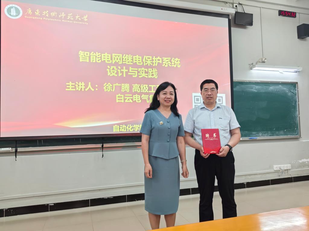 徐广腾高工长期深耕电力系统自动化、电力电子、新能源及轨道交通供电等领域的技术研发工作。现任轨道交通供电系统新技术、新产品研发负责人,并兼任伟德国际victor1946毕业设计第二指导教师。讲座中,徐工围绕以“全站信息数字化、通信平台网络化、信息共享标准化、系统功能集成化、结构设计紧凑化、高压设备智能化和运行状态可视化”为特征的智能变电站展开讲解,生动阐述了其具备支持电网实时自动控制、智能调节、在线分析决策及协同互动等高级功能的关键特性。