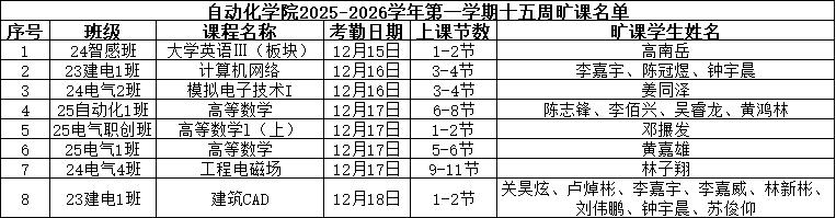 现将伟德国际victor19462025-2026学年第一学期15周课堂缺勤情况公示如下: