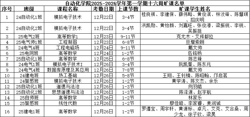 现将伟德国际victor19462025-2026学年第一学期16周课堂缺勤情况公示如下: