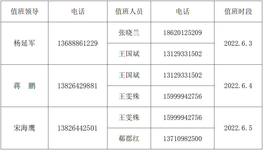 2022年端午节假期值班表