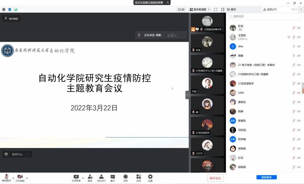 为了更进一步加强公司研究生关于新冠疫情防控的教育,强化研究生疫情防控意识,严守公司的各项防控要求,3月23日晚,公司召开了伟德国际victor1946研究生疫情防控主题教育会议,公司党委副书记蒋鹏、副经理张先勇出席了会议,会议由辅导员王国斌主持,全体研究生参加。